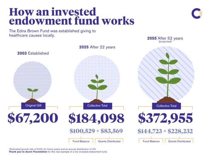 Edna left a gift in her will which she specified should go to local healthcare causes. The Acorn Foundation invested this gift, which has grown and gifted to the community every year since 2003.