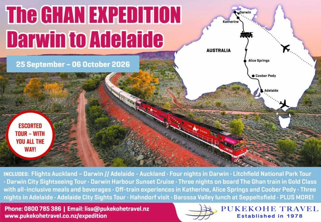 Pukekohe Travel offers several escorted tours each year aboard The Ghan and the Indian Pacific as well as bookings for independent travellers.